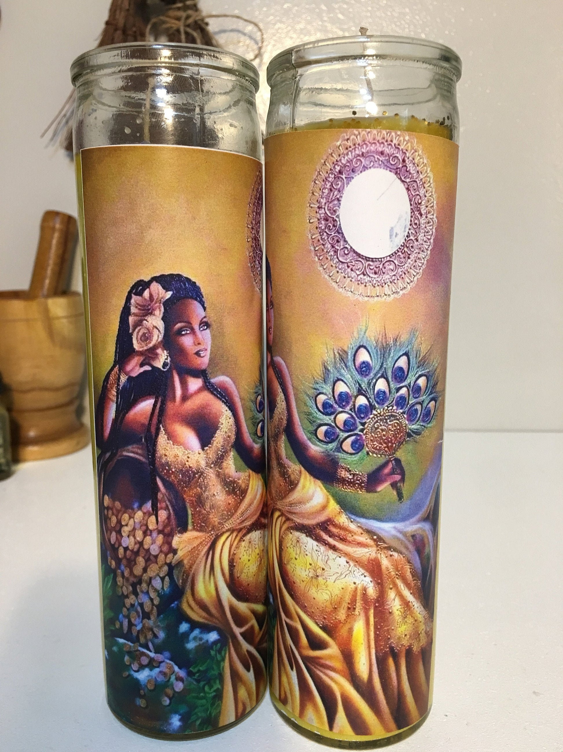Oshun Goddess Yellow Dressed Conjured Candle + Oshun Oil, Diosa Oshun Veladora Preparada