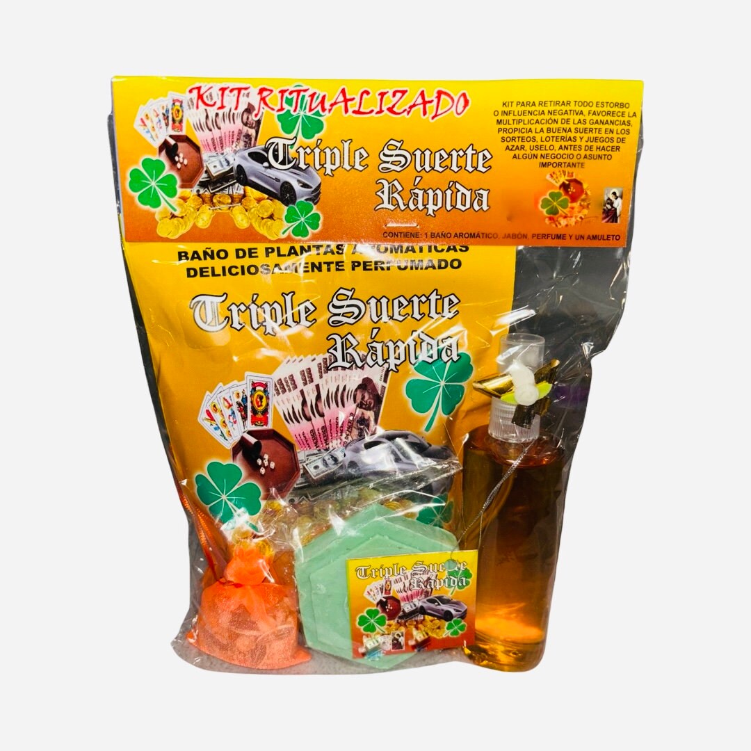 TRIPLE SUERTE RAPIDA Kit Ritualizado con Perfume + Baño Aromatico + Jabon + Amuleto